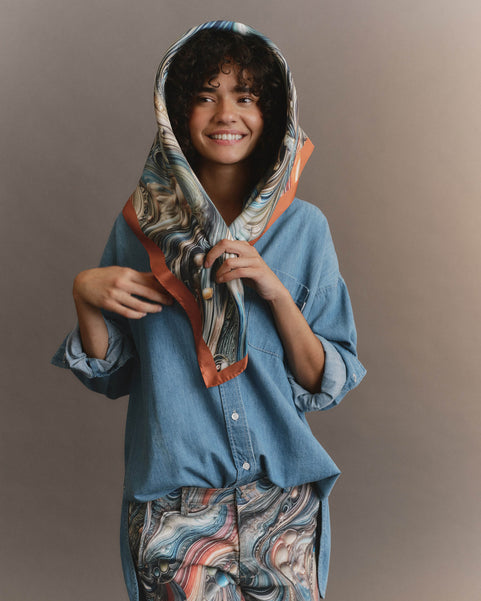 Every print has its own story. Our artists tapped into personal sources of inspiration: the Northern Lights, moonlit ocean waves, desert landscapes, a midnight drive through a sleeping city with the windows down and the music up. Wind in the trees, porcelain beading, the discovery of a hidden garden. Drawing from these influences, the artists reached for watercolors, acrylics, pastels, charcoal, photography, and a range of traditional media to interpret their unique vision. These original works were then digitized as prints and translated into wearable pieces of art, with AG fabrics serving as the canvas.